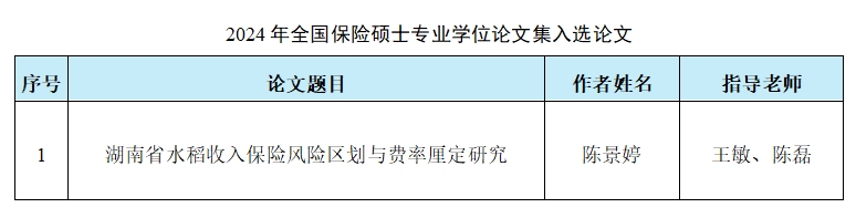 2024年,保险教指委共评审出11篇全国保险硕士优秀专业学位论文。由A动漫 王敏副教授和校外导师陈磊老师共同指导的,2023届保险专硕研究生陈景婷同学完成的《湖南省水稻收入保险风险区划与费率厘定研究》专业学位论文成功入选全国保险硕士专业学位论文集。