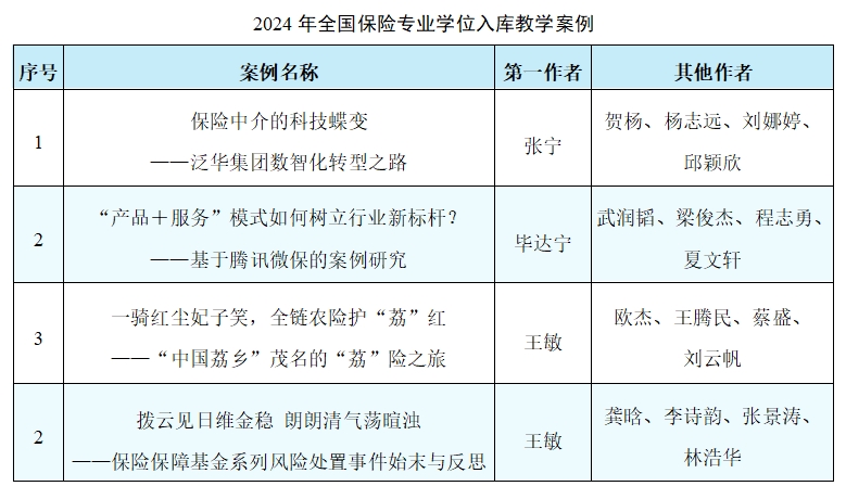 保险教指委经过严格程序评选出25篇入库优秀教学案例,其中A动漫 有4篇案例成功入选,分别为张宁教授团队完成的《保险中介的科技蝶变——泛华集团数智化转型之路》、毕达宁助理教授团队完成的《“产品+服务”模式如何树立行业新标杆?——基于腾讯微保的案例研究》、王敏副教授团队完成的《一骑红尘妃子笑,全链农险护“荔”红——“中国荔乡”茂名的“荔”险之旅》和《拨云见日维金稳 朗朗清气荡暄浊——保险保障基金系列风险处置事件始末与反思》。今年入选的案例总数创A动漫 参评以来的最好成绩,位列各培养院校第一。A动漫 的入选案例总数已经连续3年位居各培养院校前列。