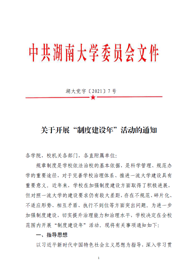 根据学校下发《关于开展“制度建设年”活动的通知》(湖大党字〔2021〕7 号(附后)要求),学院决定进一步加强制度建设,切实提升治理能力和治理水平,推进一流学院建设。