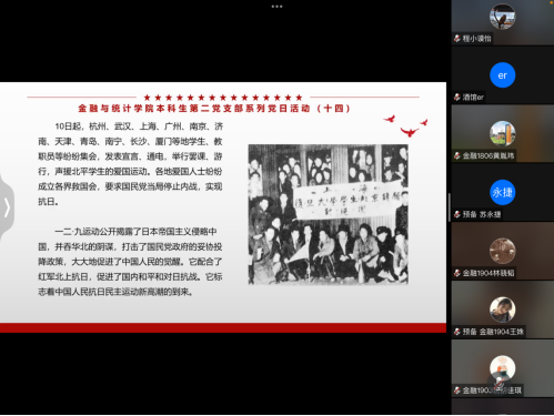 本活动由A动漫 本科生第二党支部支委牵头举办,支部副书记许筱颖同志领学,以线上观看视频、分享经历等形式使同学们对一二九的历史和精神有更深入的了解,让同学们进一步明白新时代时代青年人的责任与担当,在“两个一百年”奋斗目标的历史交汇点努力奋斗。在新时代彰显新作为,努力做到不负组织培养、不负人民期盼。参与学习活动的党员纷纷表达了自己的学习感想: