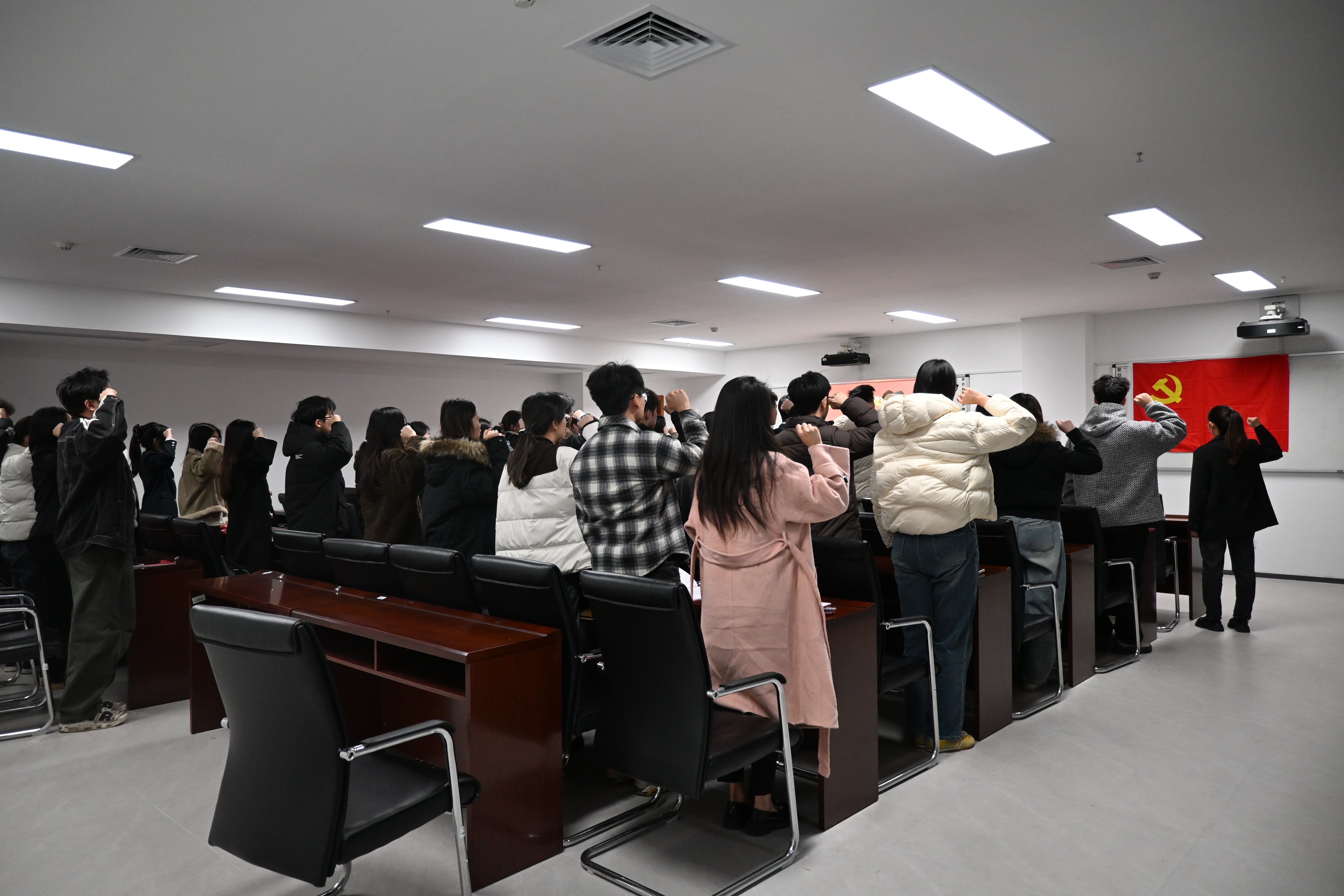 全体预备党员面对党旗,举起右拳庄严宣誓,铮铮誓言彰显着对党的忠诚与为共产主义事业奋斗终身的决心。