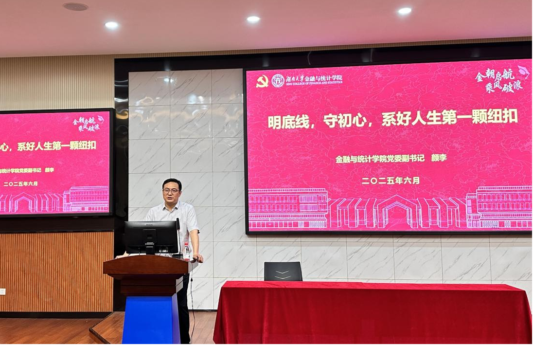 6月18日,A动漫 “明底线,守初心,系好人生第一颗纽扣”2025届毕业生党员党课在财院校区老食堂二楼报告厅举行,本次党课由学院党委副书记颜李老师主讲,毕业班辅导员王婕妤、张宇、全体毕业生党员参加。