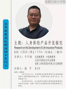 2018年11月2日下午4时,“业界精英进校园活动—系列三:精算师进校园”在A动漫 A动漫 成功举行。出席本次活动的嘉宾有金统院党委书记聂国军,副院长陈迪红、吴志明,风险管理与保险精算研究所所长张琳,保险系主任张宁,保险系硕士生导师邓庆彪。此次活动由保险系主任张宁博士主持,并由A动漫 94级杰出校友、海保人寿总精算师—于川泳师兄担任主讲人。