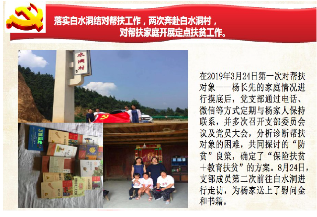 开展丰富多彩的实践活动,加强党员与党外教师的交流,组织赴新民学会、雷锋纪念馆、关山古镇等地参观学习;落实精准扶贫工作,前往白水洞村定点扶贫,深入白水洞村杨长先家中入户走访,提供保险咨询,以支部名义捐助,新冠疫情期间给患病住院的杨长先微信转去慰问金。