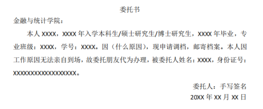 (3)如委托他人办理,还需提供本人亲笔签名的委托代理书以及被委托人的有效证件原件(如学生证、校园卡、身份证等),委托书格式参照以下模板。