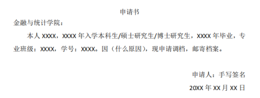 (1)学院只接受单位调档,不接受个人提档,所有需要调档的校友请提供调档函办理相关事宜。调档函中需提供接收单位的详细邮寄信息,格式如下: